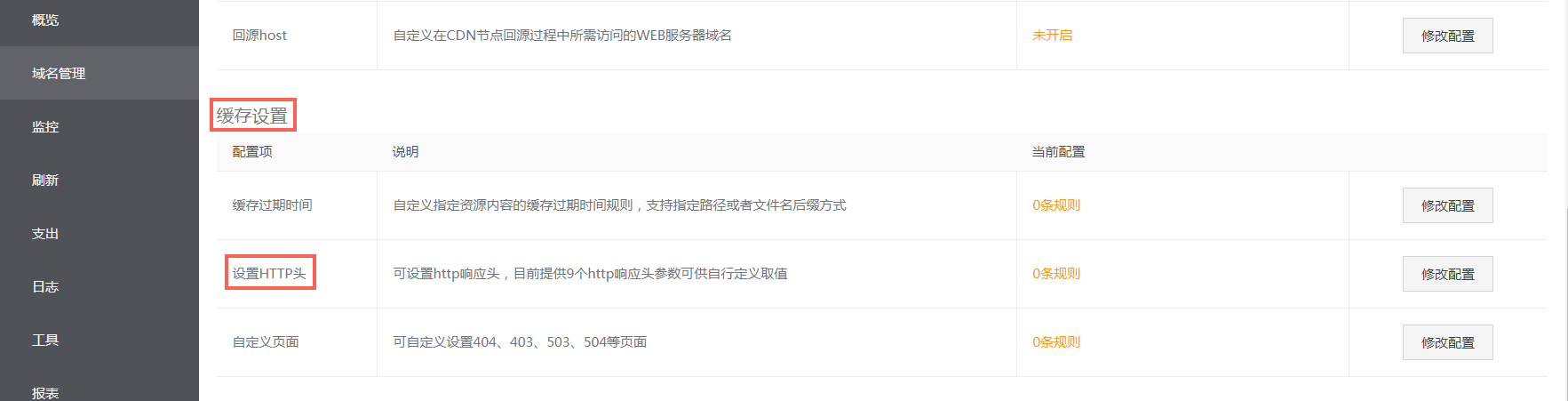 步骤一:在域名列表中点击需要配置cors功能的域名,进行域名配置管理界面: