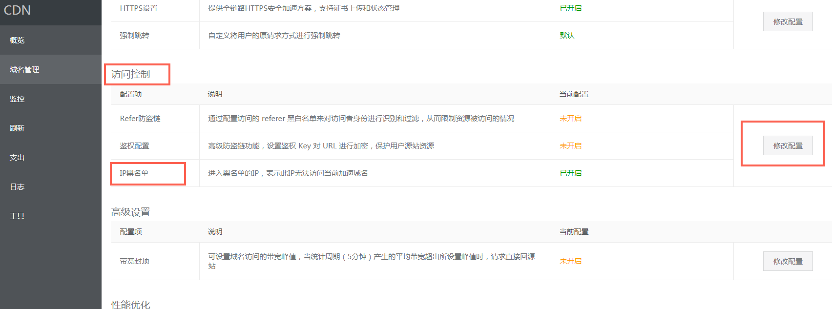 3、进入配置页找到【访问控制】的【IP黑名单】功能,点击【修改配置】。