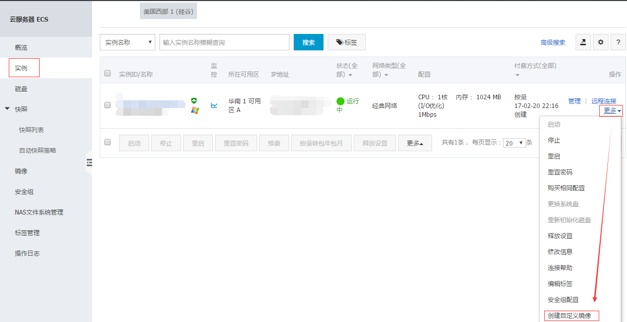 4】找到需要的实例。单击列表最右侧的更多>创建自定义镜像(如下图)
