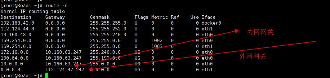 显示的 default 后面的 IP 即是内网网关跟外网网关,如下图所示(如下图所示)